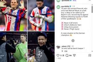 体育资讯3月17日讯 据《RMC》报道,拜仁16岁门将普雷斯科特几周前还是在诺伊尔身后捡球的球童,如今他有望成为球队队史出场第二年轻球员,仅次于万纳尔。