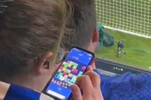 欧冠1/8决赛次回合,切尔西主场0-3巴黎圣日耳曼(总比分2-8),看台上的一位切尔西球迷玩起了游戏。