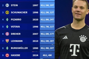 40岁零8天!诺伊尔成为德甲第11位40+岁出场球员