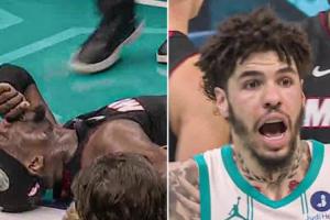 在昨日黄蜂战胜热火的附加赛上半场,拉梅洛·鲍尔倒地后手臂扫到了阿德巴约的脚踝,导致后者受伤退赛。