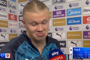 哈兰德:我觉得如果我当时倒在地上——我不会轻易倒地,除非有人真的对我犯规——也许就会是红牌。我不确定,我还没看过那个画面,但事情就是这样。我不会那么容易倒地。我吃到了一张黄牌,不太清楚为什么,但是他冲着我的脸就来了。就是这样。