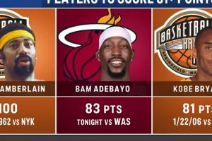 体育资讯03月11日讯 NBA常规赛,热火150-129击败奇才。阿德巴约单场砍下83分,超越科比NBA历史第2。