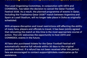 官方:2026年卡塔尔足球节因旅行中断和领空关闭取消